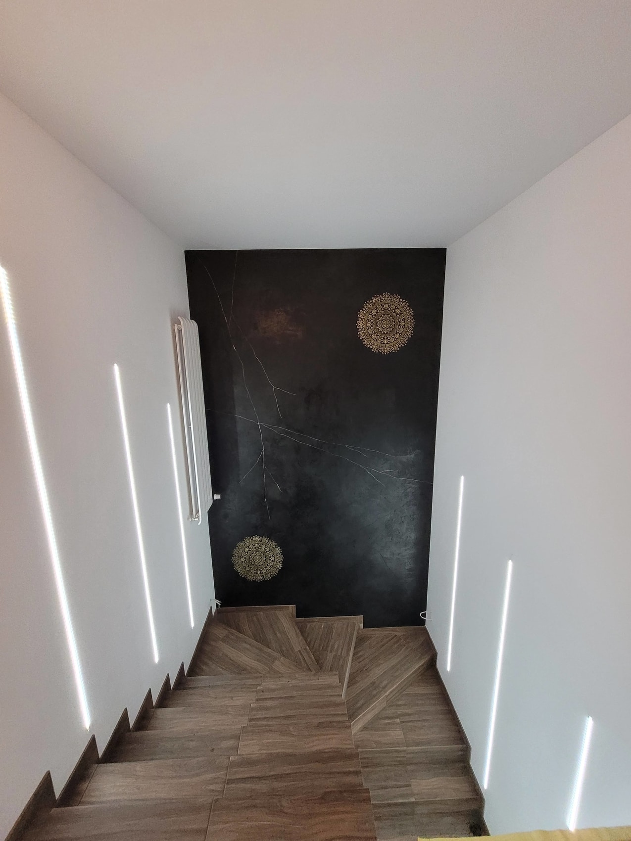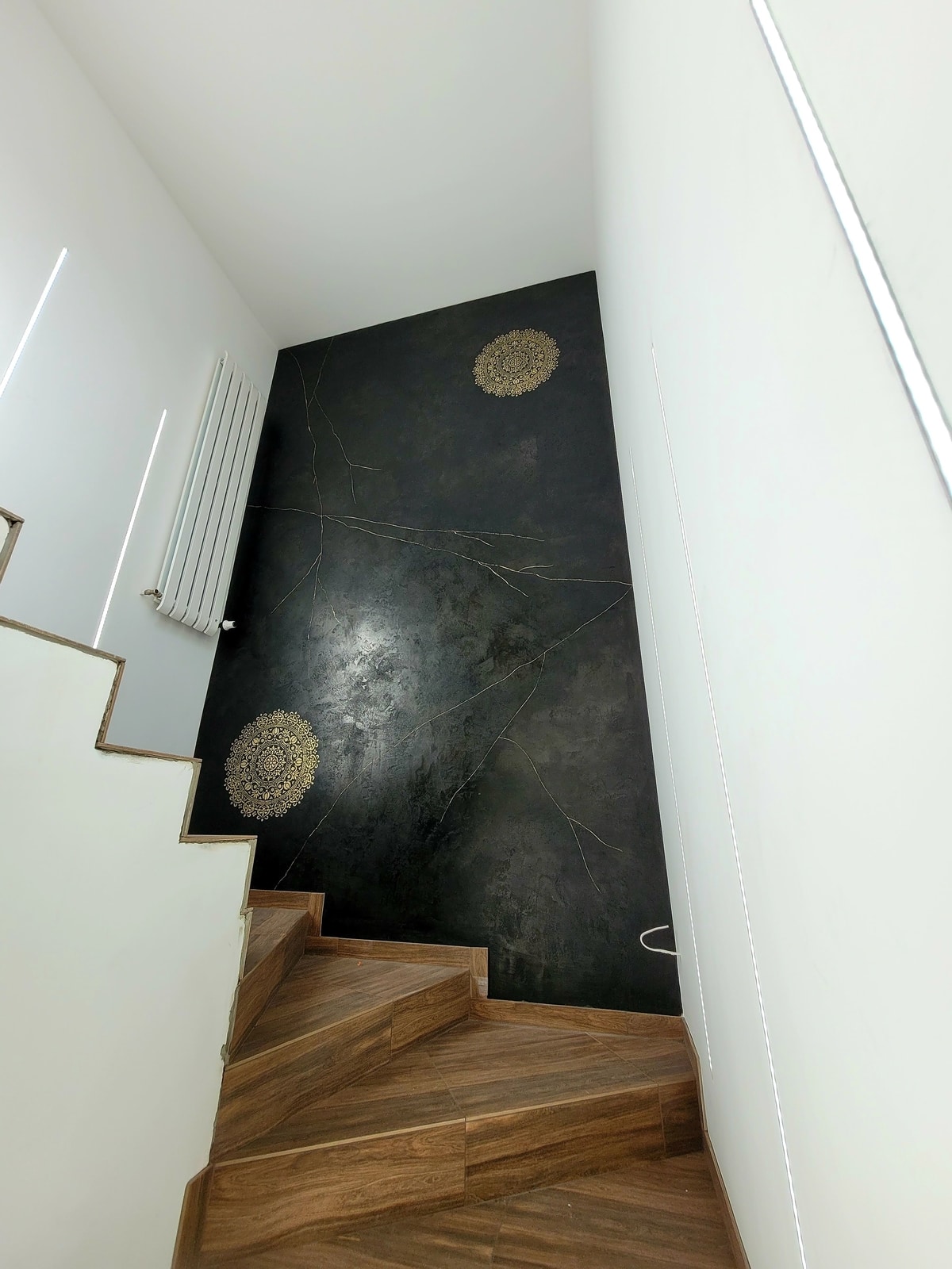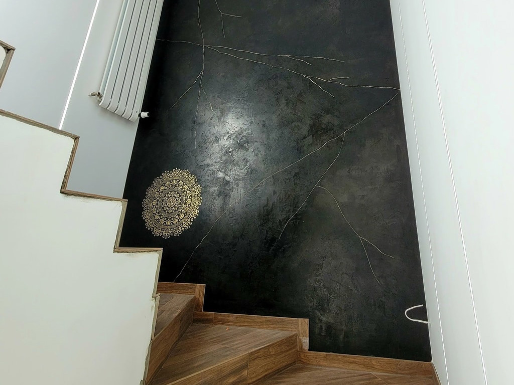 Oprócz walorów estetycznych, taki projekt ściany na klatce schodowej ma też praktyczne zastosowanie. Czarny tynk dekoracyjny to materiał odporny na uszkodzenia, łatwy w utrzymaniu czystości i nie wymagający malowania czy tapetowania. Wzór mandali, naniesiony na ścianę przy pomocy odpowiedniego szablonu, będzie z kolei trwałym i oryginalnym elementem dekoracyjnym.
