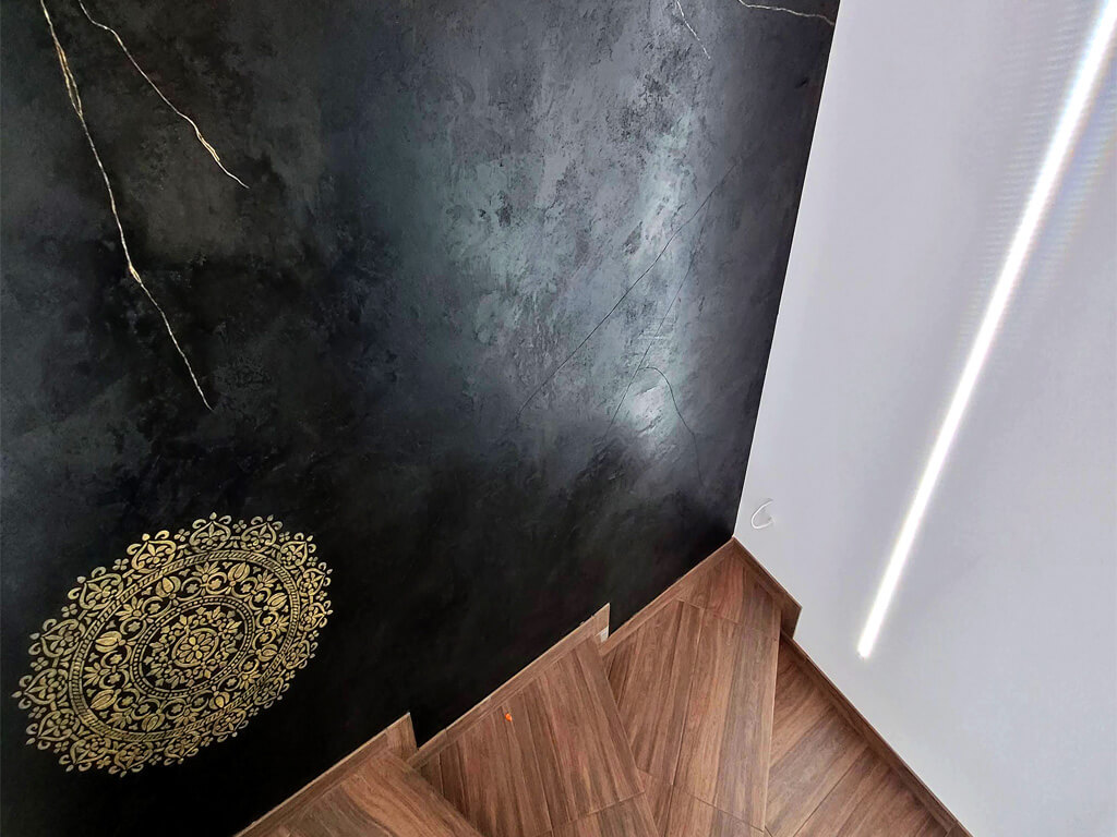 Taki projekt doskonale wpisuje się w trendy nowoczesnego designu, który stawia na minimalistyczne i surowe formy, wzbogacone o subtelne, ale efektowne dodatki. Czarny tynk dekoracyjny, który naśladuje fakturę betonu, to doskonała baza dla dodatków w jasnym kolorze, takim jak złoto. Mandala, czyli geometryczny wzór z tradycji hinduistycznej, w kolorze złotym, pięknie kontrastuje z czarną, surową powierzchnią tynku i dodaje jej elegancji i charakteru.